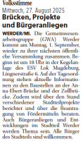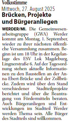 Volksstimme 27.08.2025 - Ankündigung GWA-Versammlung am 01.09.2025