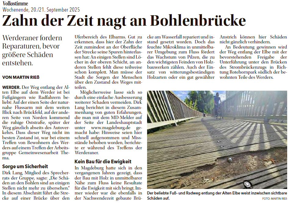 Volksstimme 20.09.2025 - Schäden an Holzbohlenweg an Alter Elbe