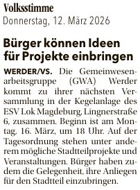 Volksstimme 12.03.2026 - Ankündigung GWA-Versammlung am 16.03.2026