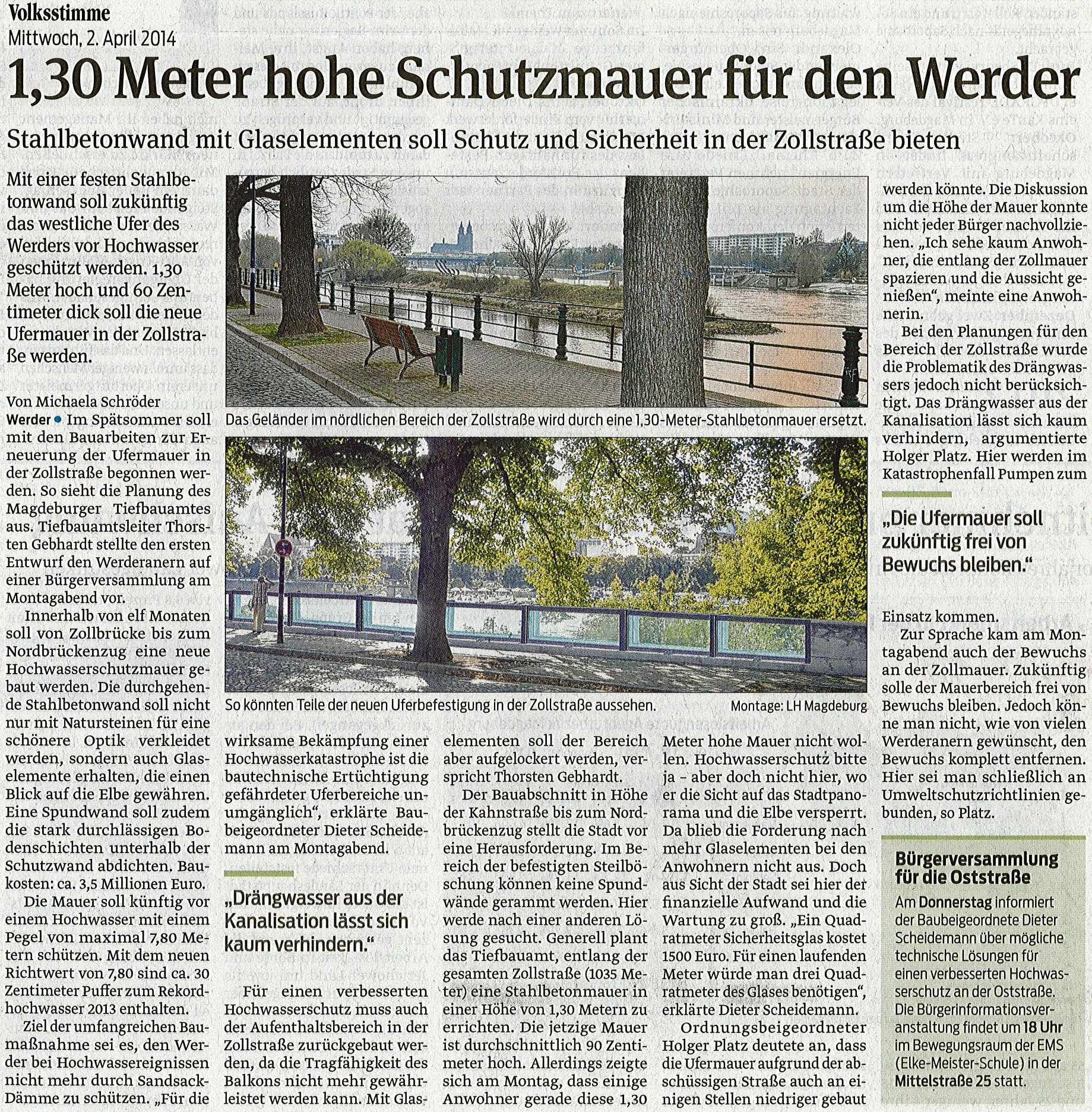 Volksstimme 02.04.2014 - Bericht Hochwasserschutzmauer Zollstrasse