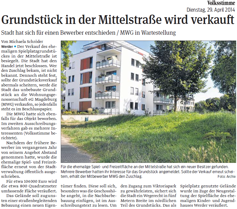 Volksstimme 29.04.2014 - Verkauf Grundstück Mittelstraße