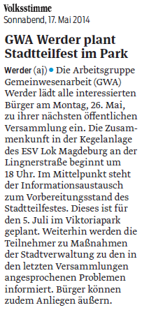 Volksstimme 07.05.2014 - Ankündigung GWA-Versammlung und Stadtteilfest