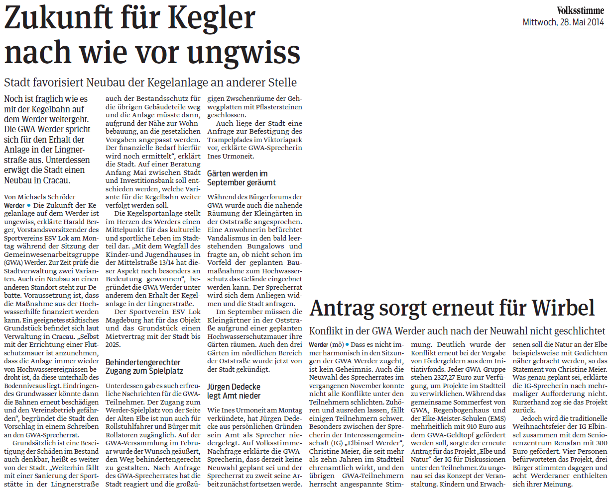 Volksstimme 28.05.2014 - Bericht zur GWA-Versammlung am 26.05.2014