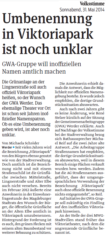 Volksstimme 31.05.2014 - Namensgebung Viktoriapark