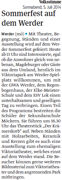 Volksstimme 03.07.2014 - Ankündigung Stadtteilfest Werder