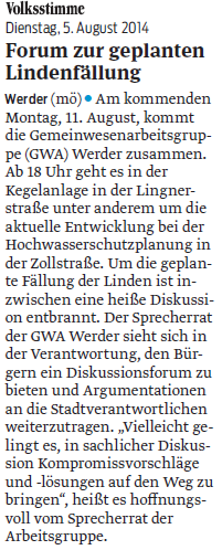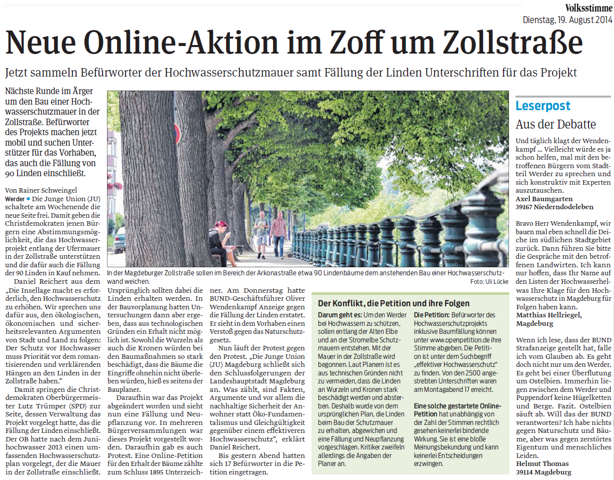 Volksstimme 19.08.2014 - Online-Aktion für Notwendigkeit der Lindenfällung