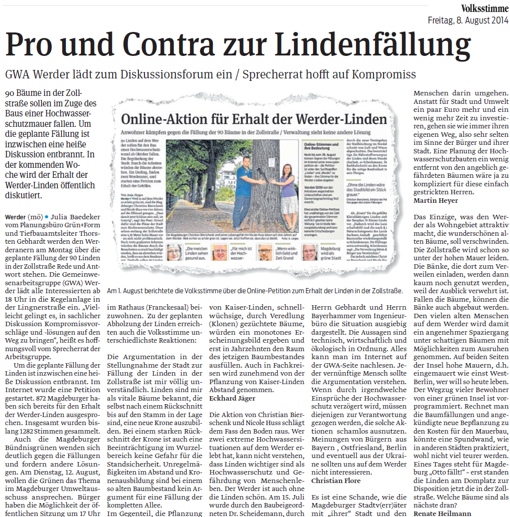 Volksstimme 08.08.2014 - Pro und Contra zur Lindenfällung