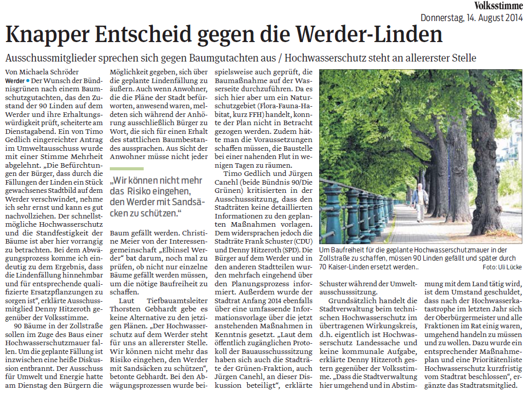 Volksstimme 14.08.2014 - Lindenfällung Umweltausschuss