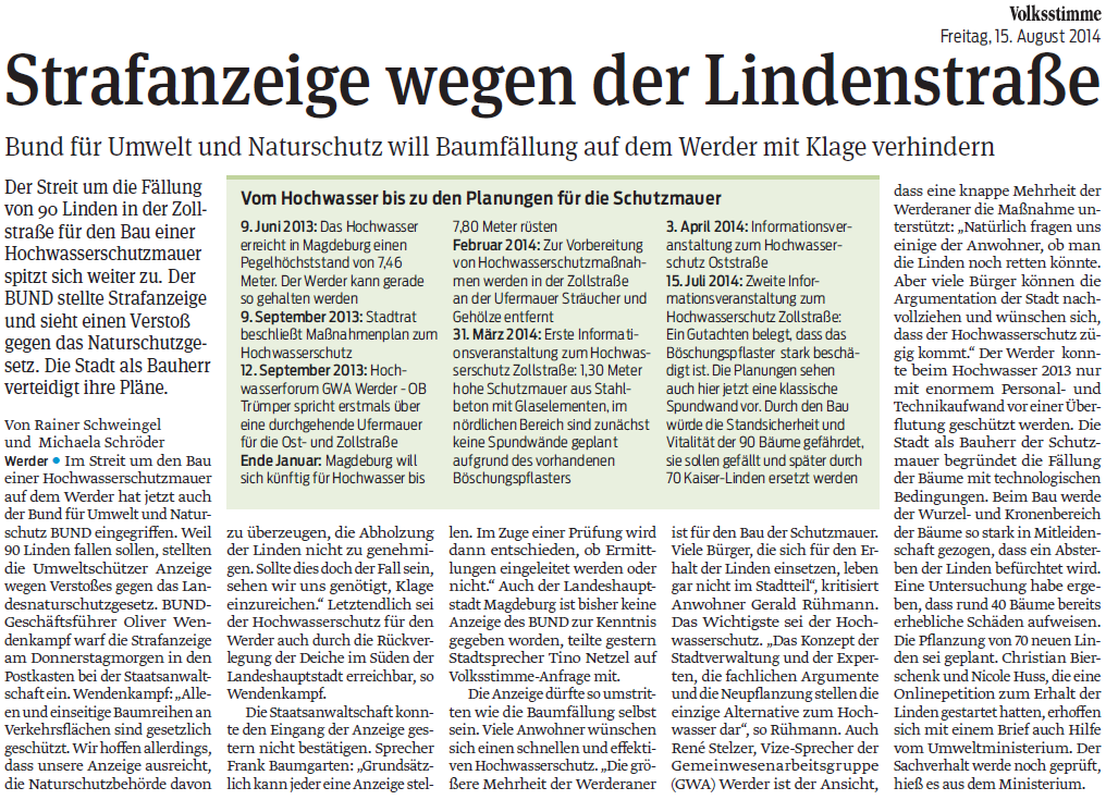 Volksstimme 15.08.2014 - Strafanzeige_von BUND gegen Lindenfällung