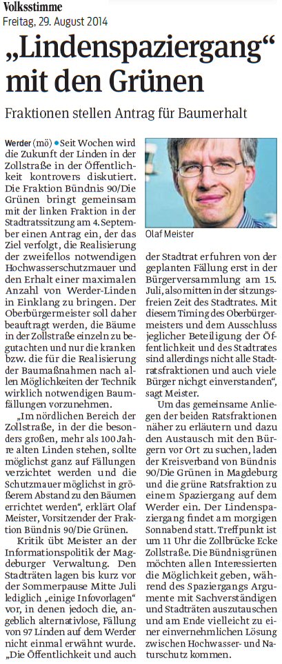 Volksstimme 29.08.2014 - Lindenspaziergang Zollstraße am 30.08.2014