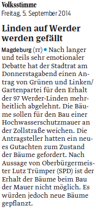 Volksstimme 05.09.2014 - Stadtrat: Entscheidung für Lindenfällung