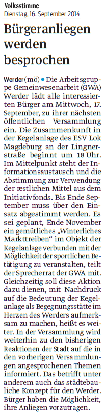 Volksstimme 16.09.2014 - Ankuendigung GWA-Versammlung am 17.09.2014