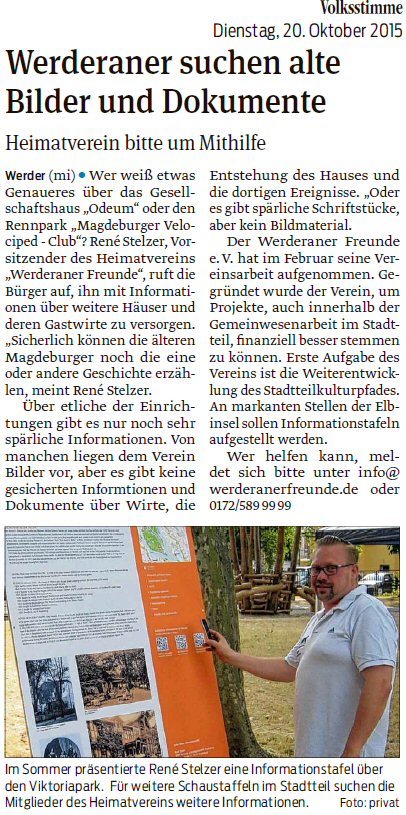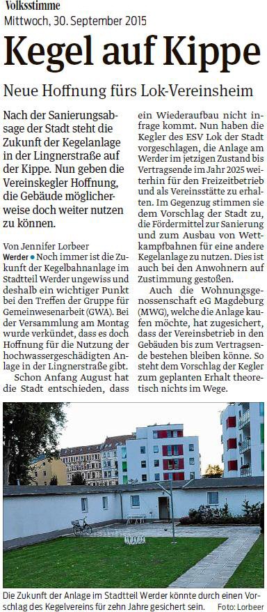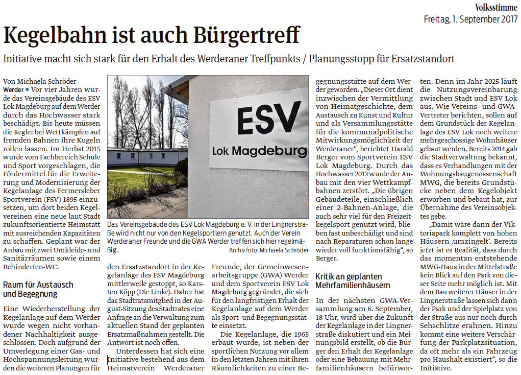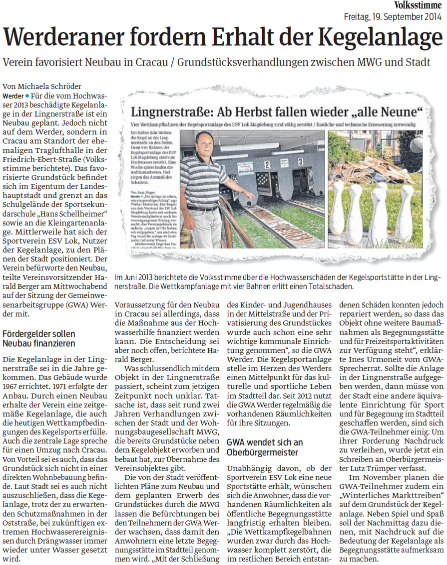 Volksstimme 19.09.2014 - Werderaner für Erhalt der Kegelanlage