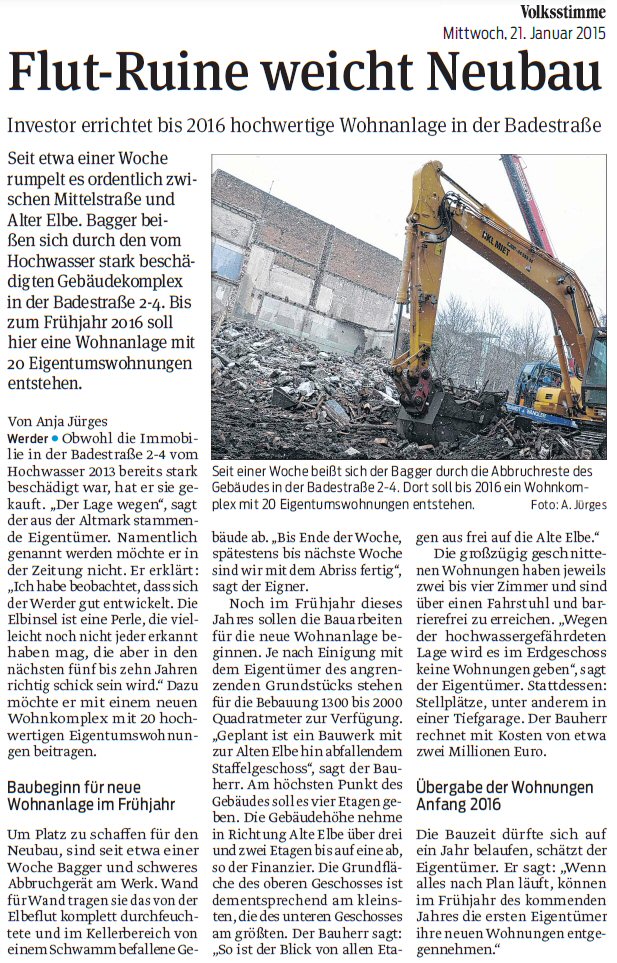 Volksstimme 21.01.2015 - Neue Wohnanlage in Badestraße