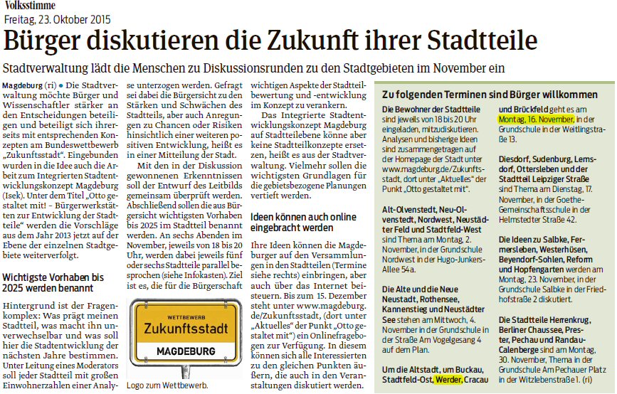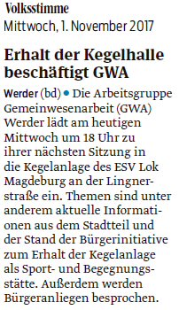 Volksstimme 15.11.2014 - Ankündigung GWA-Versammlng am 18.11.2014