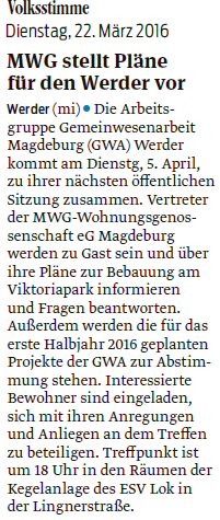 Volksstimme 13.03.2014 - Ankündigung GWA-Versammlung