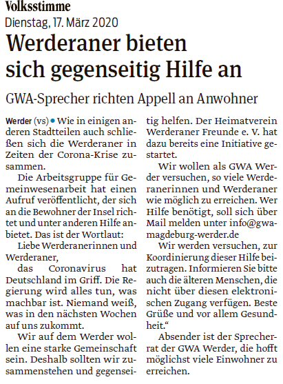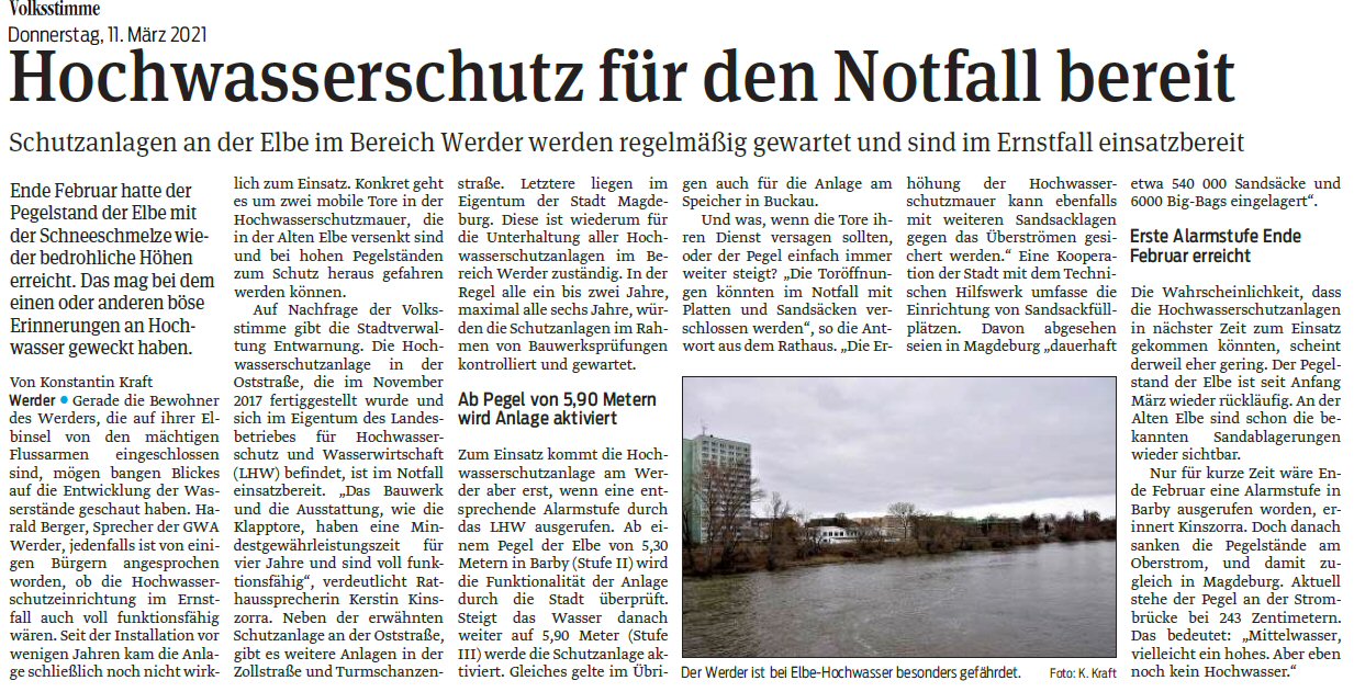 Volksstimme 17.04.2014 - Bericht zu Hochwasserinformationen auf der GWA-Werder-Webseite