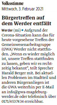 Volksstimme 03.02.2022 - Bericht zur GWA-Versammlung am 01.02.2022