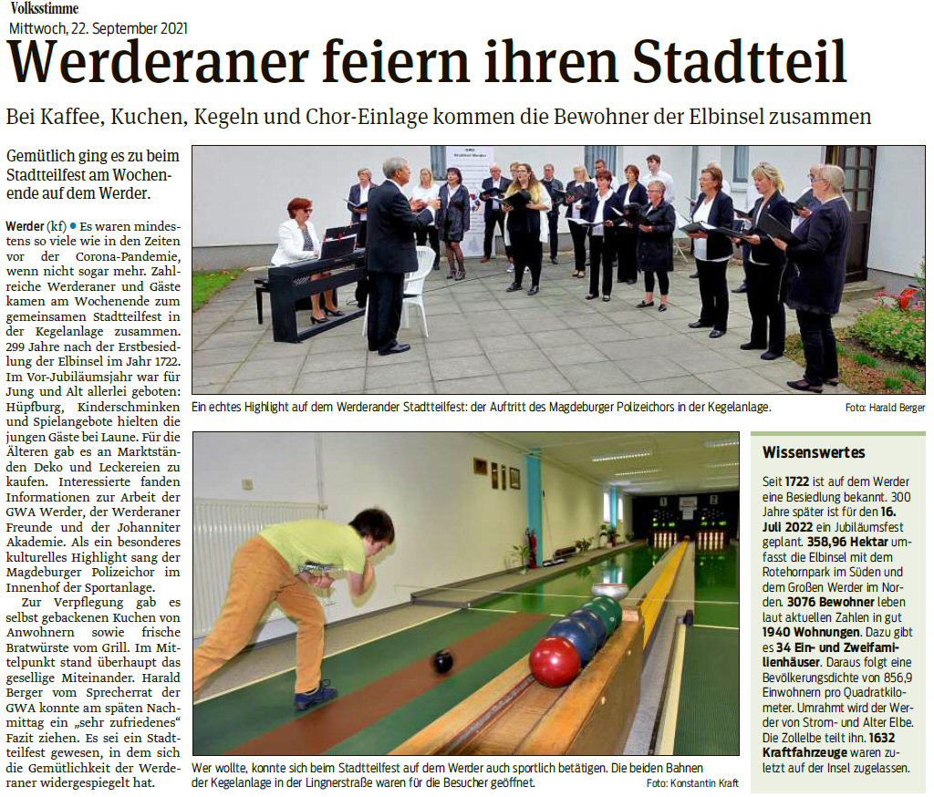 Volksstimme 22.09.2021 - Bericht Stadtteilfest Werder am 18.09.2021