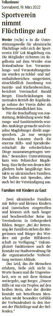 Volksstimme 19.03.2022 - Flüchtlingsaufnahme in Kegelanlage
