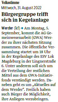 Volksstimme 31.08.2022 - Ankündigung GWA-Versammlung am 05.09.2022