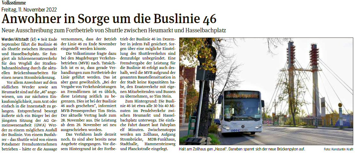 Volksstimme 11.11.2022 - Bericht GWA-Versammlung Schienenersatzverkehr