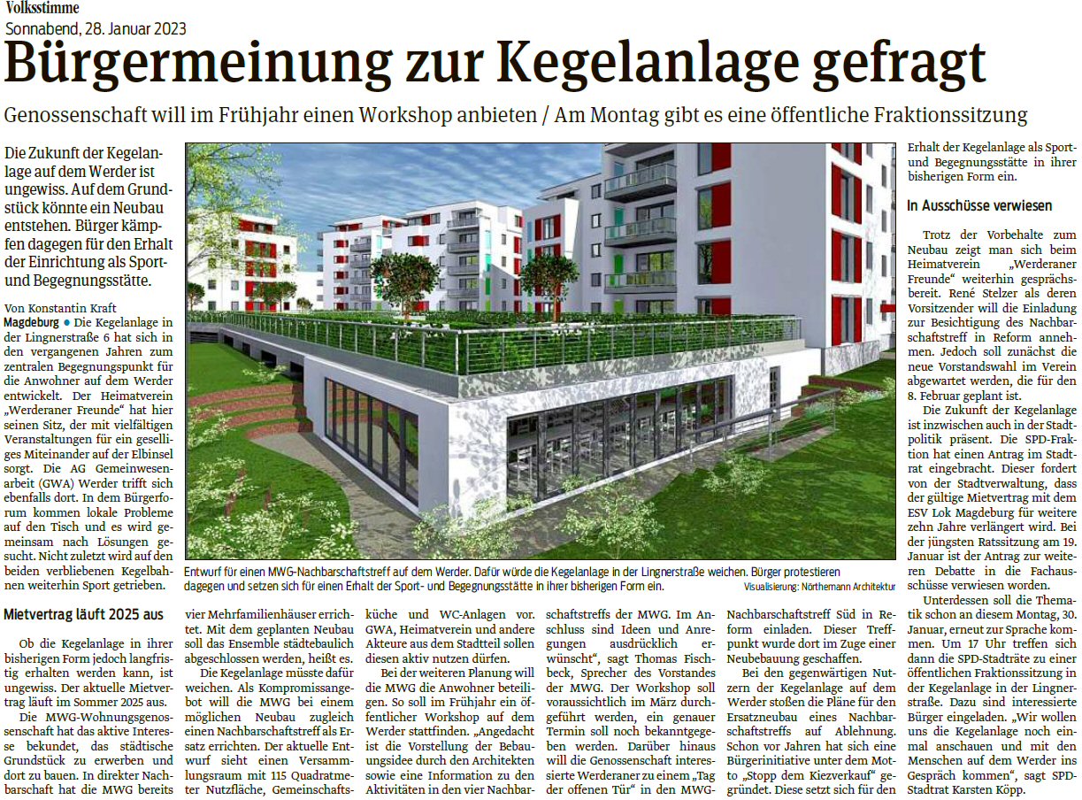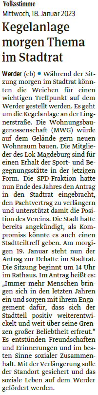 Volksstimme 19.01.2023 - Kegelanlagenthema aus der Sicht der MWG
