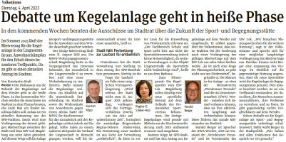 Volksstimme 04.04.2023 - Debatte um Kegelanlage