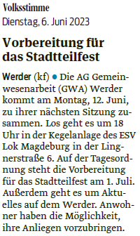 Volksstimme 23.06.2023 - Ankündigung Stadtteilfest Werder am 01.07.2023