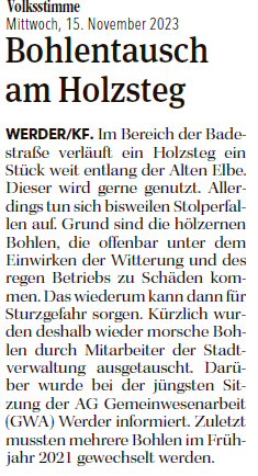 Volksstimme 15.11.2023 - Reparatur Bohlen am Holzsteg