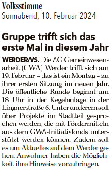 Volksstimme 10.02.2024 - Ankündigung GWA-Versammlung am 19.02.2024