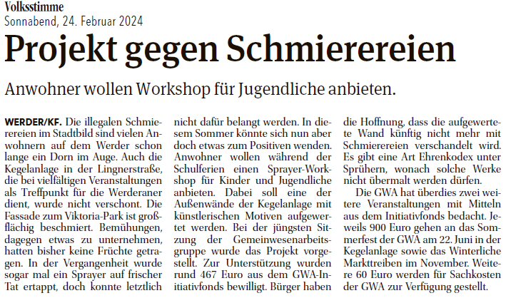 Volksstimme 24.02.2024 - Bericht GWA-Versammlung zum Thema Graffiti-Projekt