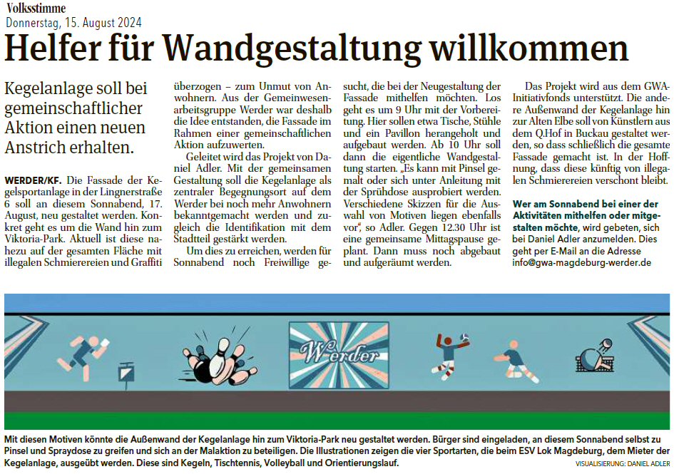 Volksstimme 15.08.2024 - Projekt Außenwandgestaltung Kegelanlage, Aufruf zur Mitmach-Aktion