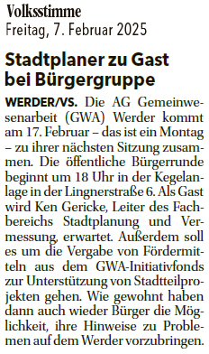 Volksstimme 07.02.2025 - Ankündigung GWA-Versammlung am 17.02.2025